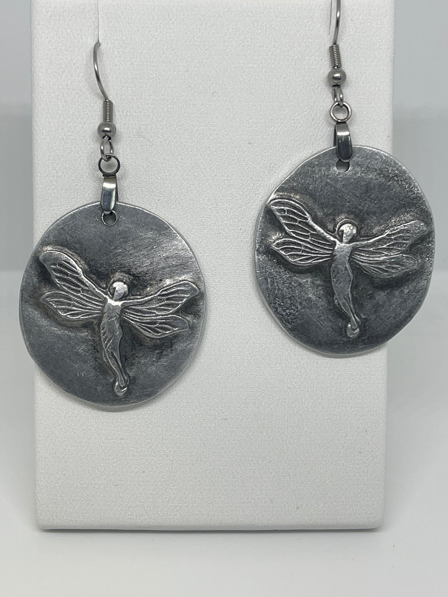 Hand-cut aluminum earrings featuring raised fairy medallions with a softly antiqued finish. The circular form frames the fairy in gentle relief, highlighting delicate wing detail and subtle movement.